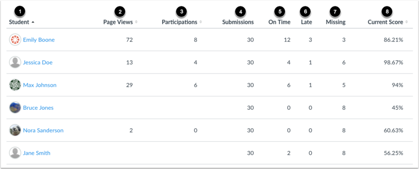 The Submissions Graph shows the status of each assignment in the course. The x-axis represents the assignments, while the y-axis represents the percentage of submissions for all students in the course.
