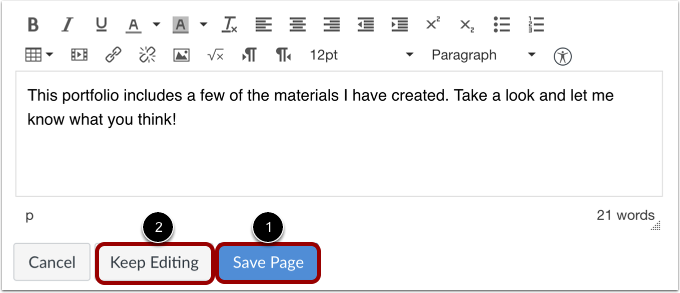 You can save the changes you made by clicking the Save Page button [1]. If you would like to continue making changes, click the Keep Editing button [2].