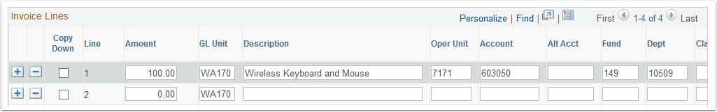 Note: The number of lines that appear by default is controlled by the Estimated No. of Invoice Lines from the Add a New Value page. Use only those you need (there is no need to delete unused lines) and add lines as you need them (using the icon). Enter the following values: