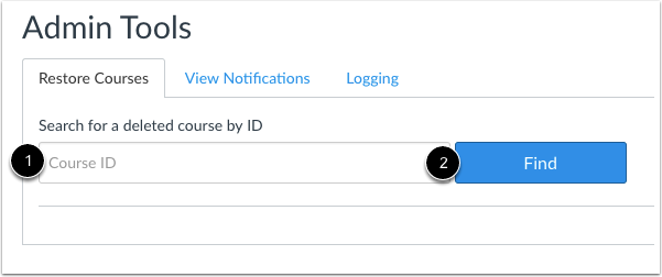 In the Course ID field [1], enter the Course ID of the course you want to restore. Click the Find button [2].