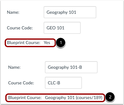If your course is associated with a blueprint course, your Course Details tab indicates the name of the blueprint course [2]. The course name also includes the course ID as a reference (e.g. courses/XXX). If you have been enrolled in the blueprint course as an instructor or TA, the name of the blueprint course will contain a link to access the blueprint course.
