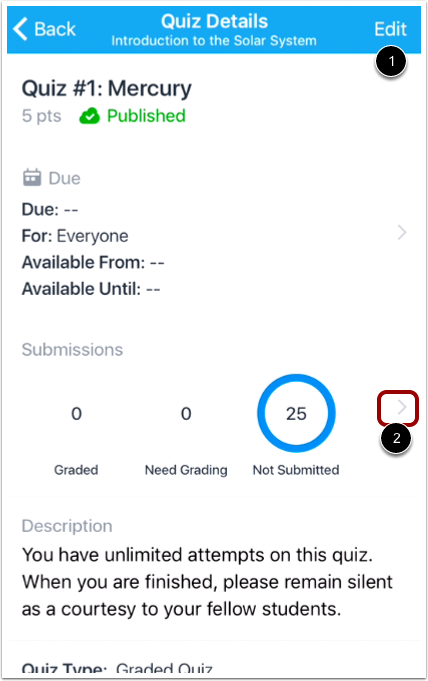 To edit the quiz details, tap the Edit link [1]. You can manage all quiz options as well as due and availability dates.